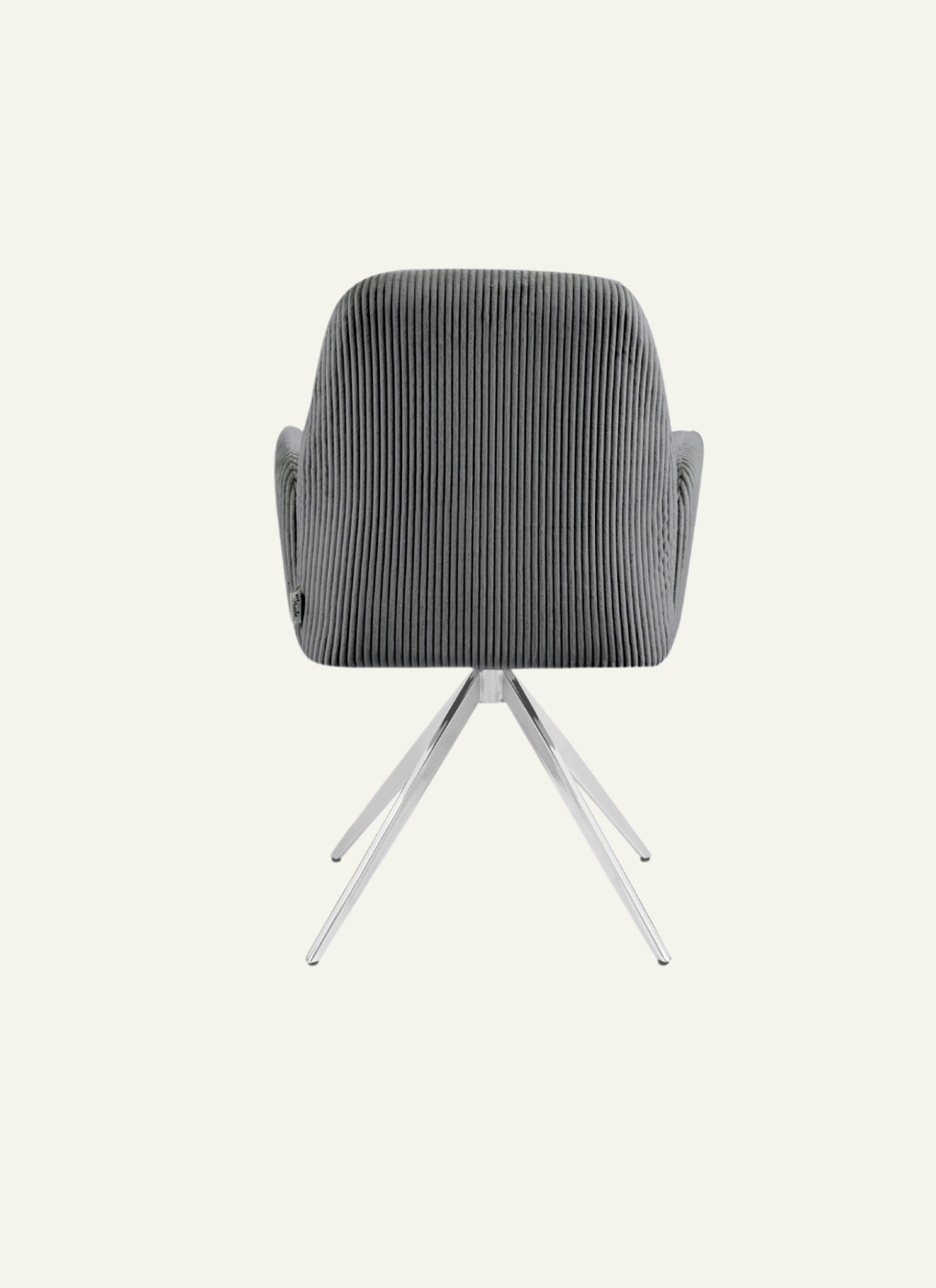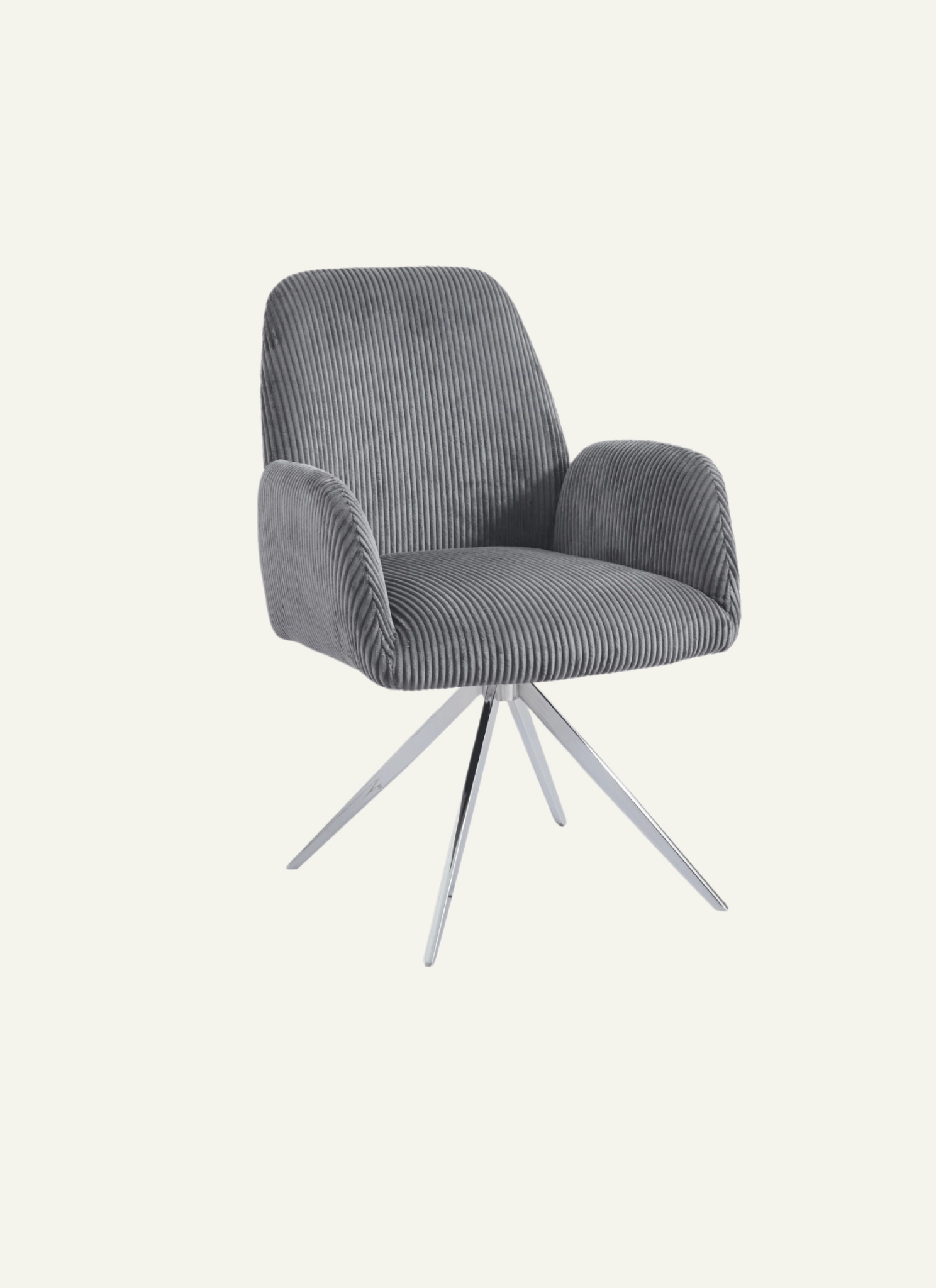 De Berlin eetkamerstoel in het grijs met zilveren metalen poten is een symbool van moderne elegantie en tijdloze stijl. Deze stoel is bekleed met een hoogwaardige grijze ribstof die een zachte touch en een verfijnde visuele textuur aan uw interieur toevoegt. Het glanzende zilveren onderstel biedt een stabiele basis en voegt een luxueus, eigentijds accent toe dat perfect past in elk modern decor. Dankzij de ergonomische kuipzitting en de comfortabele armleuningen biedt deze stoel een uitzonderlijk zitgemak, waardoor hij ideaal is voor zowel lange diners als dagelijks gebruik in uw woon- of werkruimte.