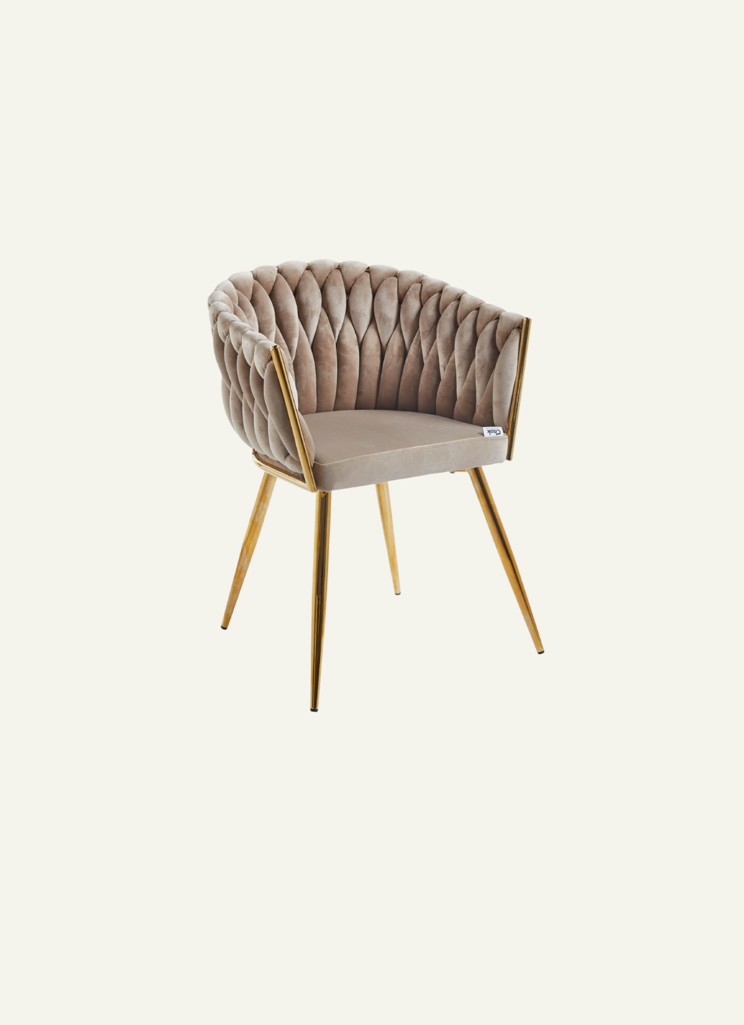 De Porto eetkamerstoel in het vison met gouden metalen poten is de perfecte belichaming van moderne luxe en warme elegantie. Deze stoel is bekleed met een hoogwaardige visonkleurige stof die een zachte, uitnodigende sfeer in uw interieur brengt. De rugleuning is aan de binnenzijde voorzien van verfijnde verticale stiksels, wat zorgt voor een stijlvol accent en een luxueuze uitstraling. Het glanzende goudkleurige onderstel biedt een stabiele basis en voegt een glamoureuze touch toe aan uw eethoek. Dankzij de ergonomische vormgeving en de comfortabele armleuningen geniet u van een optimaal zitcomfort, ideaal voor lange, sfeervolle diners.