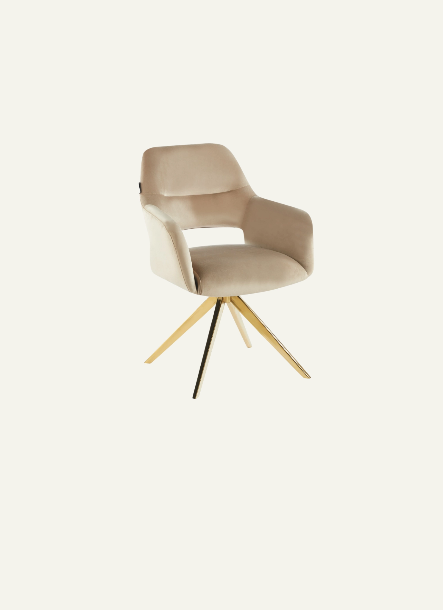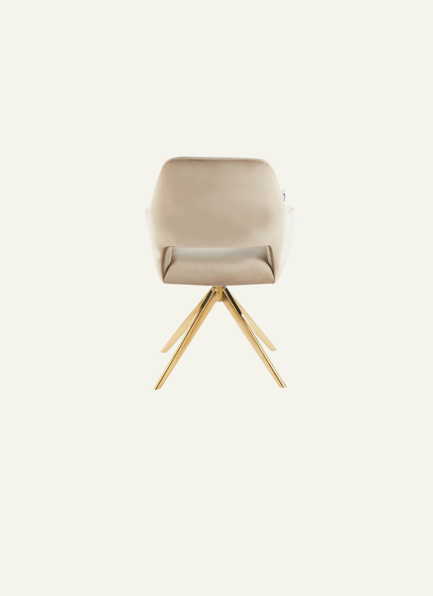 De Royal eetkamerstoel in het licht beige met gouden metalen poten is de ultieme belichaming van luxe en verfijnde stijl. De stoel is bekleed met een hoogwaardige licht beige stof die een frisse, warme en uitnodigende uitstraling geeft aan uw interieur. De rugleuning loopt vloeiend over in de armleuningen en is aan de binnenzijde gedetailleerd met stijlvolle verticale stiksels voor een extra luxueus accent. Het glanzende goudkleurige onderstel biedt niet alleen een stevige basis, maar voegt ook een glamoureuze touch toe aan de eettafel. Dankzij het ergonomische ontwerp en de zachte zitting is deze stoel perfect voor urenlang comfortabel tafelen in een chique omgeving.